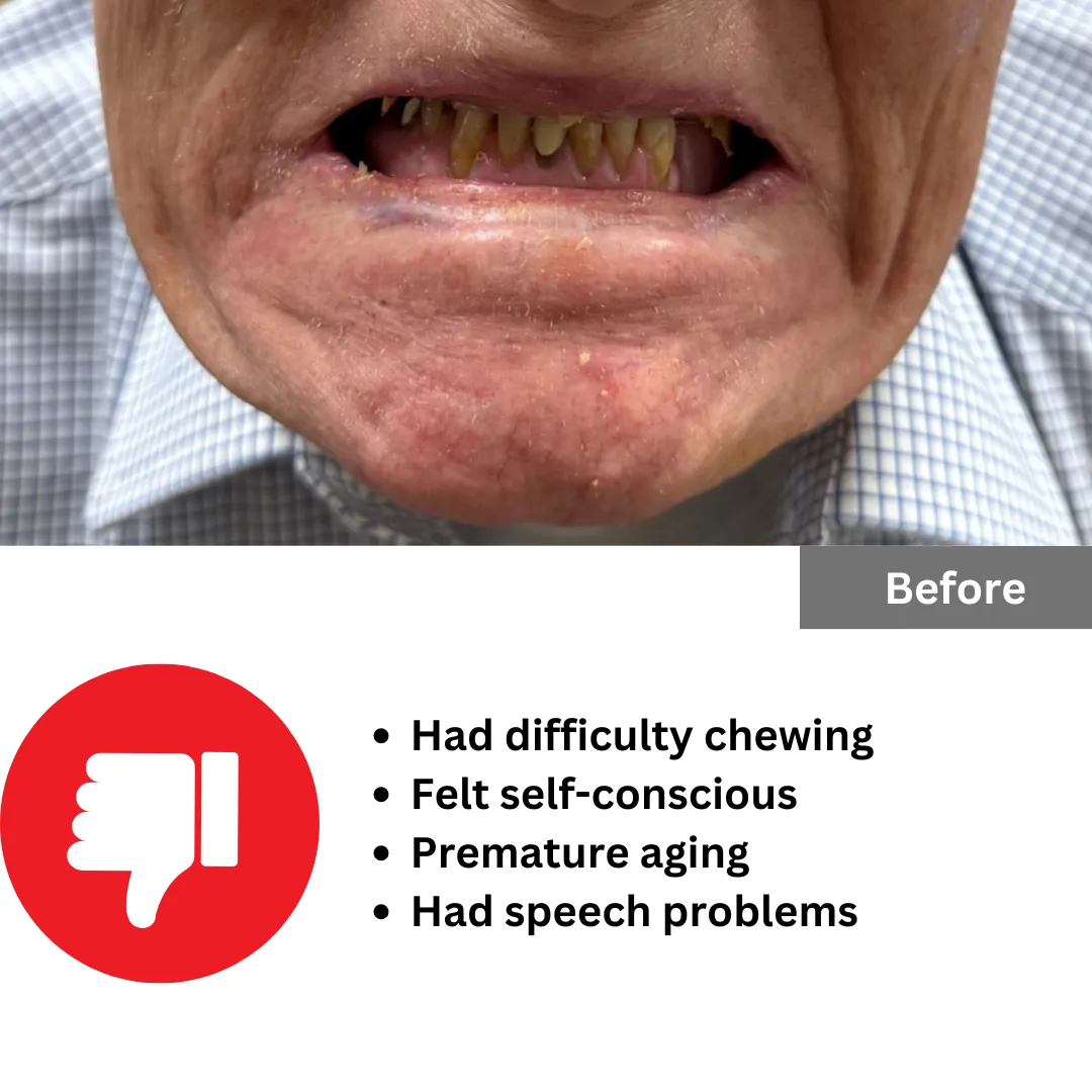 options to replace your smile - regular dentures or full arch dental implants. Many people mistakenly choose plastic dentures at first without thinking about the long term consequences. The truth is that regular dentures accelerate jaw bone loss, cause facial sagging, and make it difficult to eat food comfortably. Full arch dental implants fix all of these problems and offer a high quality of life for the long run. Dental implants can easily last 40+ years without the need for replacement.